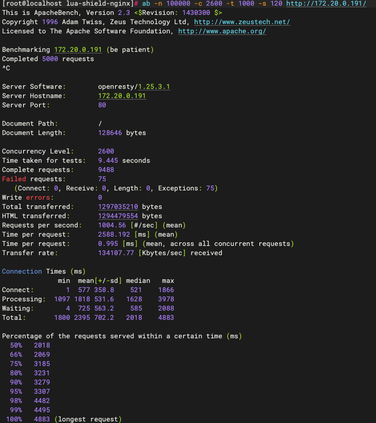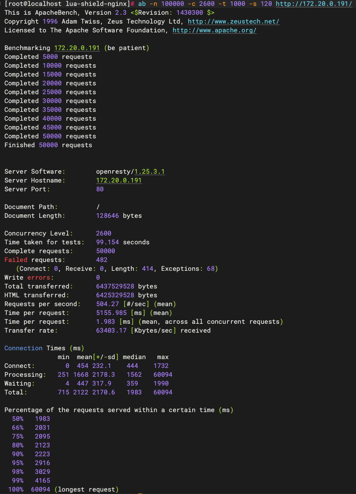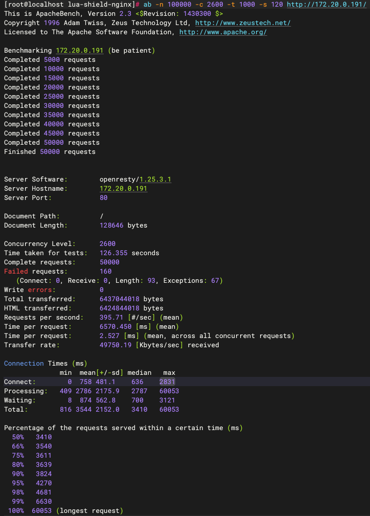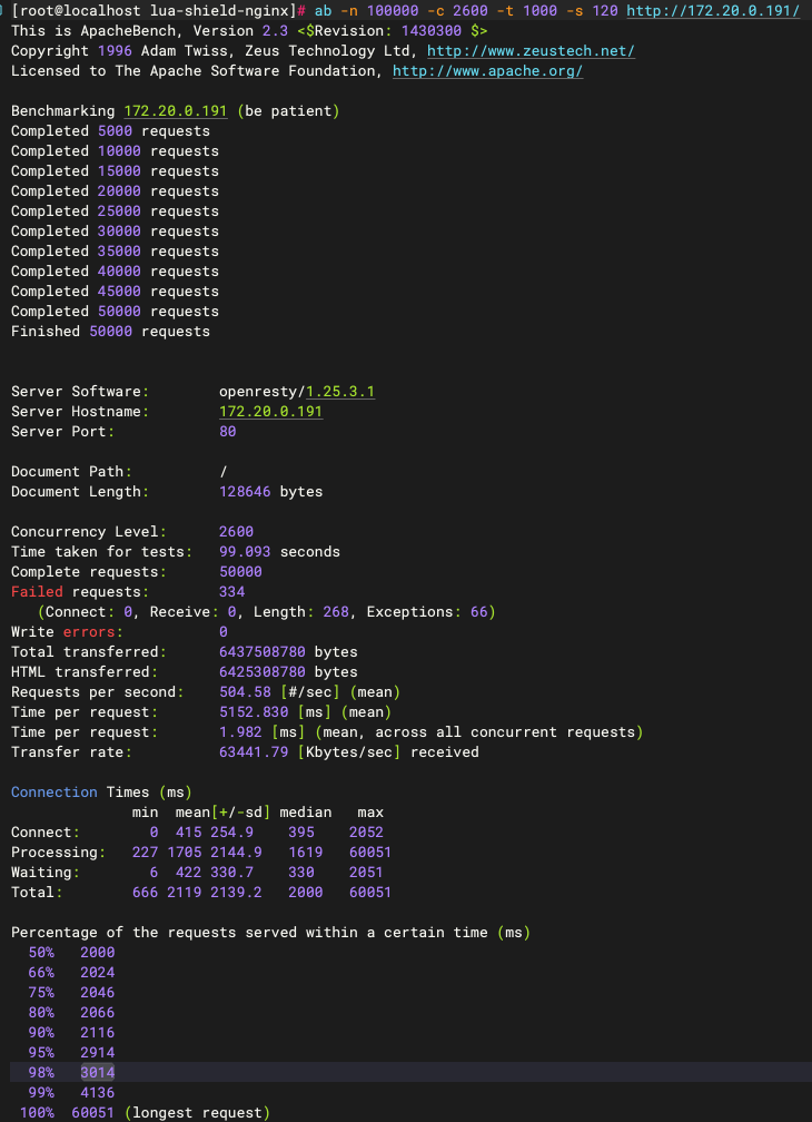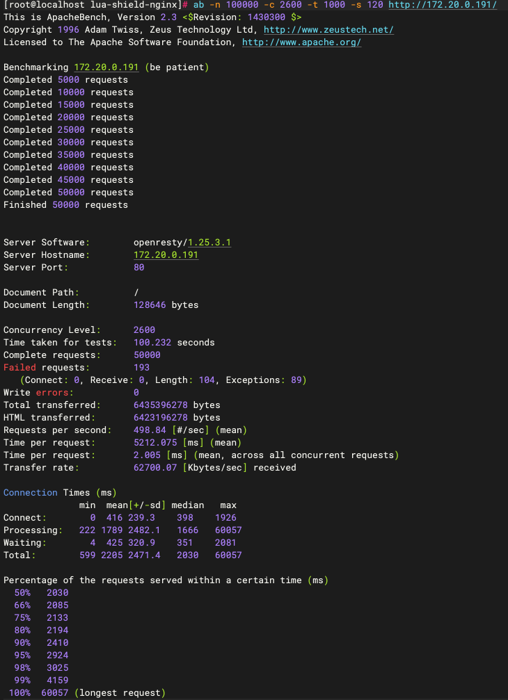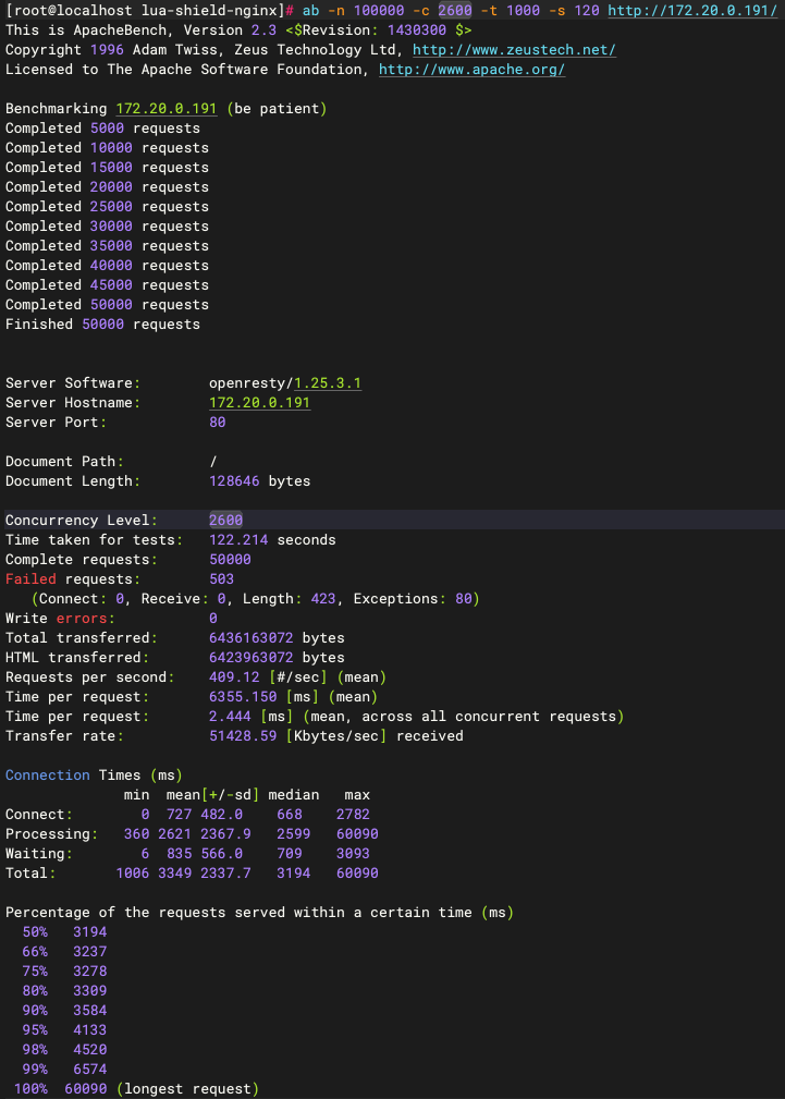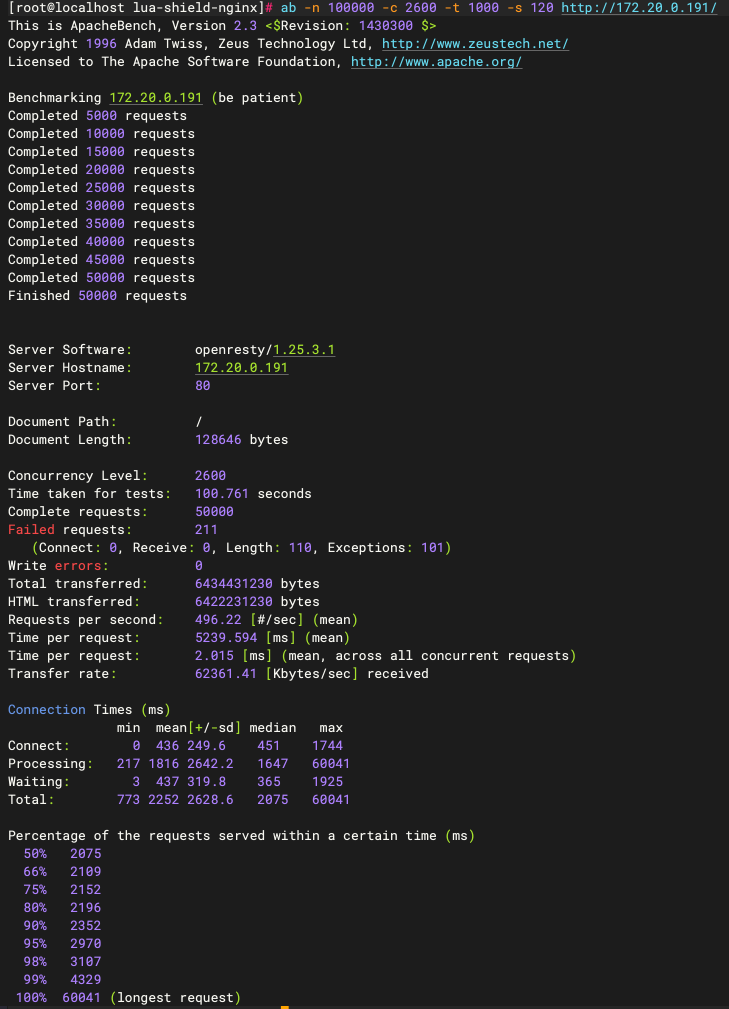 • 两次测试的并发级别(Concurrency Level)都是 2600。这意味着在这两个测试中,同时有2600个请求在运行。