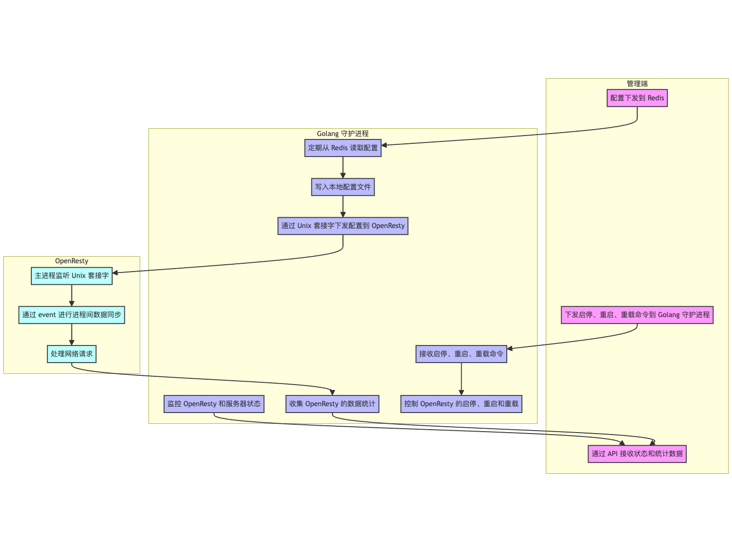 通过 Unix 套接字将新配置下发给 OpenResty,实现实时更新。